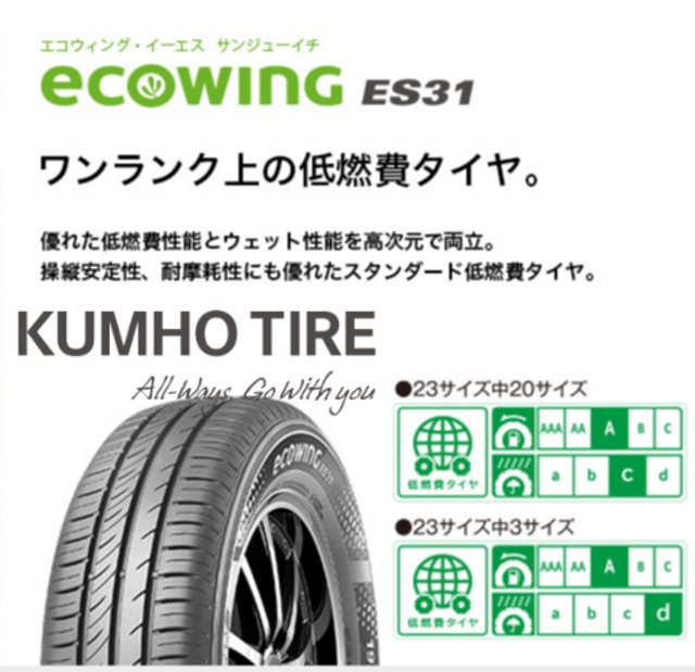 クムホタイヤ エコウィング イーエスサンイチ ワンランク上の低燃費タイヤ 操縦性能・低燃費性能・ライフ性能などいずれも犠牲にしない新構造採用 先端のコンパウンド技術により低燃費性能とウェット性能を両立 幅広い車種に対応する2種類のパターンを開発 (タイヤ代+交換工賃+廃タイヤ+ゴムバルブ+消費税/すべて含まれます。)