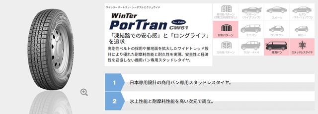 クムホ ポートラン シーダブリュウロクイチ 高剛性ベルトの採用や接地面を拡大したワイドトレッド設計により優れた耐摩耗性能と耐久性を実現。安全性と経済性を妥協しない商用バン専用スタッドレタイヤ。 (タイヤ代+交換工賃+廃タイヤ+ゴムバルブ+消費税/すべて含まれます。)