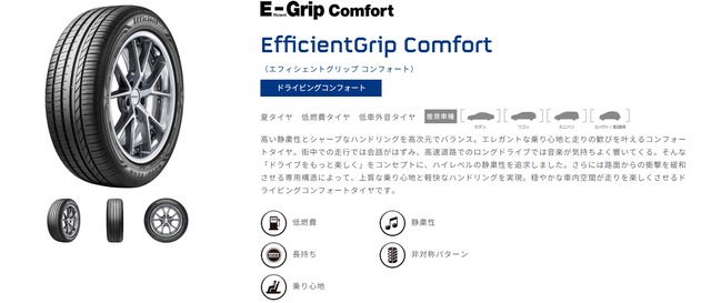 グッドイヤー エフィシエントグリップ コンフォート 高い静粛性とシャープなハンドリングを高次元でバランス。エレガントな乗り心地と走りの歓びを叶えるコンフォートタイヤ。街中での走行では会話がはずみ、高速道路でのロングドライブでは音楽が気持ちよく響いてくる。そんな「ドライブをもっと楽しく」をコンセプトに、ハイレベルの静粛性を追求しました。さらには路面からの衝撃を緩和させる専用構造によって、上質な乗り心地と軽快なハンドリングを実現。穏やかな車内空間が走りを楽しくさせるドライビングコンフォートタイヤです。 (タイヤ代+交換工賃+廃タイヤ+ゴムバルブ+消費税/すべて含まれます。)