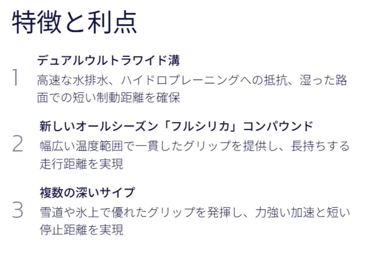 ※雪上性能を有しているタイヤですが、スタッドレスタイヤではありません。 冬季に積雪路や凍結路を日常的に走行される場合には、スタッドレスタイヤの装着を推奨します。