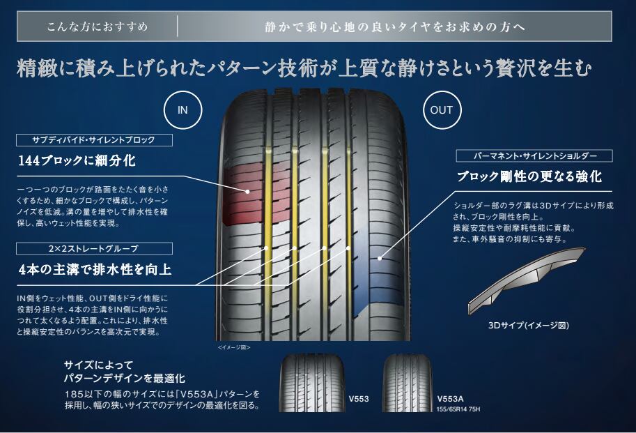 さらに進化した高い静粛性、摩耗しても静粛性が持続し易いうえ、低燃費に貢献してくれる転がり抵抗の低さと高い操縦安定性を実現。凹凸路面でも、突き上げ感が少なく、優しい乗り心地。高速走行や加速時の直進安定性が高く、リラックスして運転できます。静かで乗り心地のよいタイヤをお求めの方へおすすめです。(タイヤ+工賃・タイヤ処分・ゴムバルブ交換込みの商品です。)