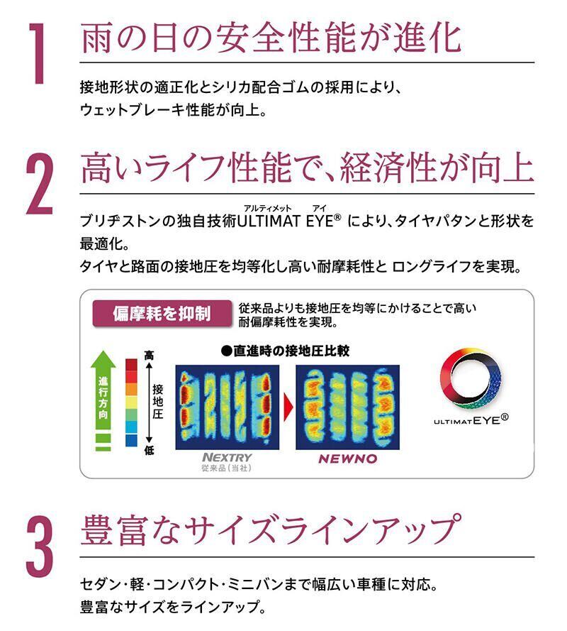 「NEWNO」はプレミアムブランドの商品に搭載されている技術を採用することで、通常は背反する関係にある低燃費性能とウェットグリップ性能、ロングライフ性能を高い次元で両立しています。